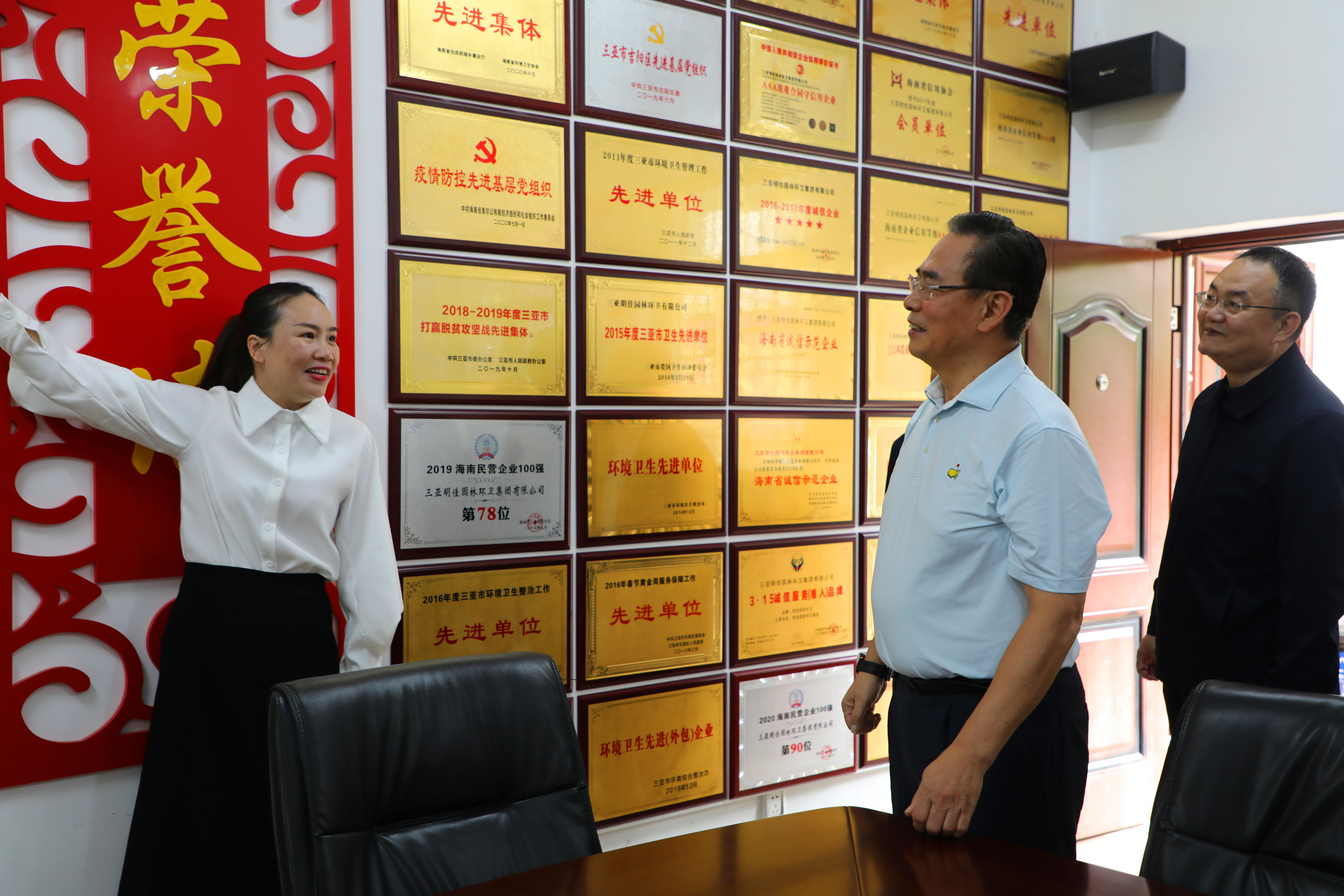 蔡副主席一行來到明佳集團職工之家,工會主席高斐斐介紹職工書屋由三亞市總撥專款、集團黨支部共同出資建立,現(xiàn)藏書一千余冊,并配備投影儀、電腦、電子閱覽器等設(shè)備,蔡副主席對職工書屋的建設(shè)表示了充分的肯定。來到企業(yè)榮譽墻面前,高斐斐介紹了近期工會工作取得的海南省工人先鋒號等榮譽,蔡副主席對工會取得的成績表示了極大的贊賞。