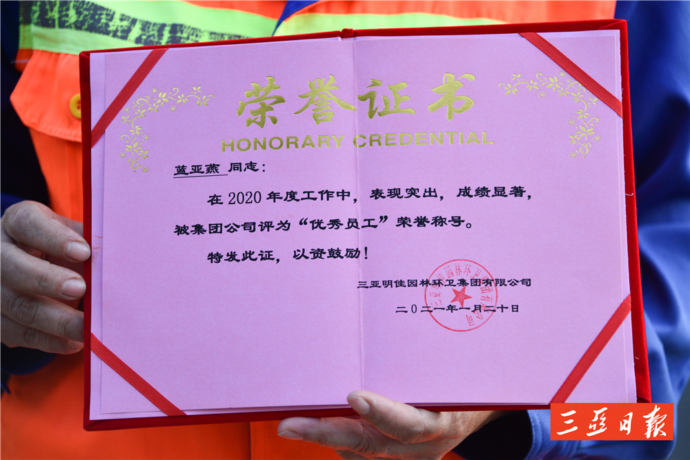 “亞燕是一個(gè)工作負(fù)責(zé)、認(rèn)真的員工,她工作讓我很放心,平時(shí)她還主動(dòng)幫助其他工人,累活也搶著干?!泵骷循h(huán)衛(wèi)天涯一隊(duì)隊(duì)長(zhǎng)林海菊這樣評(píng)價(jià)藍(lán)亞燕。