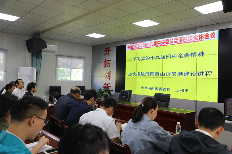 12月7日上午10:00時,一場主題為“學(xué)習(xí)貫徹黨的十九屆四中全會精神,推進海南自貿(mào)區(qū)(港)治理現(xiàn)代化”專題輔導(dǎo),在明佳集團辦公大樓三樓多功能會議廳舉辦。此次專題輔導(dǎo)報告是明佳集團黨支部為了落實上級指示,學(xué)習(xí)宣傳貫徹黨的十九屆四中全會精神,以及省委書記劉賜貴宣講黨的十九屆四中會全精神時提出的要求,組織黨員干部集中學(xué)習(xí),確保將黨的十九屆四中全會精神傳達至每一名黨員及一線員工。