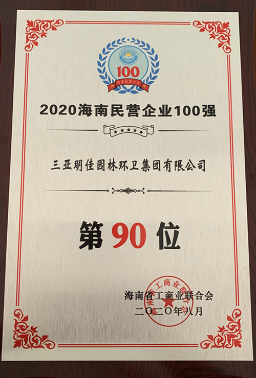 8月28日,“2020海南民營(yíng)企業(yè)百?gòu)?qiáng)發(fā)布會(huì)”在海口舉行。三亞明佳園林環(huán)衛(wèi)集團(tuán)有限公司再次入選“海南民營(yíng)企業(yè)100強(qiáng)”榜單,名列第90位。